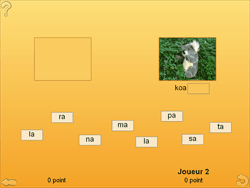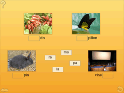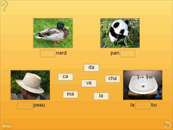 Ici, le mot correspondant est écrit, mais une syllabe manque. Il faut la retrouver parmi plusieurs qui ont toutes un phonème en commun (choisi au départ).
