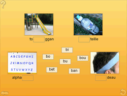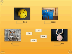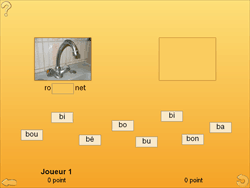 Ici, le mot correspondant est écrit, mais une syllabe manque. Il faut la retrouver parmi plusieurs qui ont toutes un phonème en commun (choisi au départ).